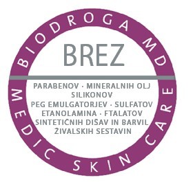 BIODROGA MD se vzdržuje vseh dodatkov, ki lahko povzročijo draženje kože in se osredotoča na učinkovine, katere bo koža najboljše prenašala. BIODROGA MD MEDIC SKIN CARE ne vsebuje parabenov (methyl parabens), mineralnih olj (paraffinum liquidum), silikonov (dimethicones), PEG (PEG emulsifiers), sulfatov (sodium sulfate), etanolaminov (DEA, TEA, MEA), sintetični barvil, sintetičnih dišav in živalskih sestavin.
