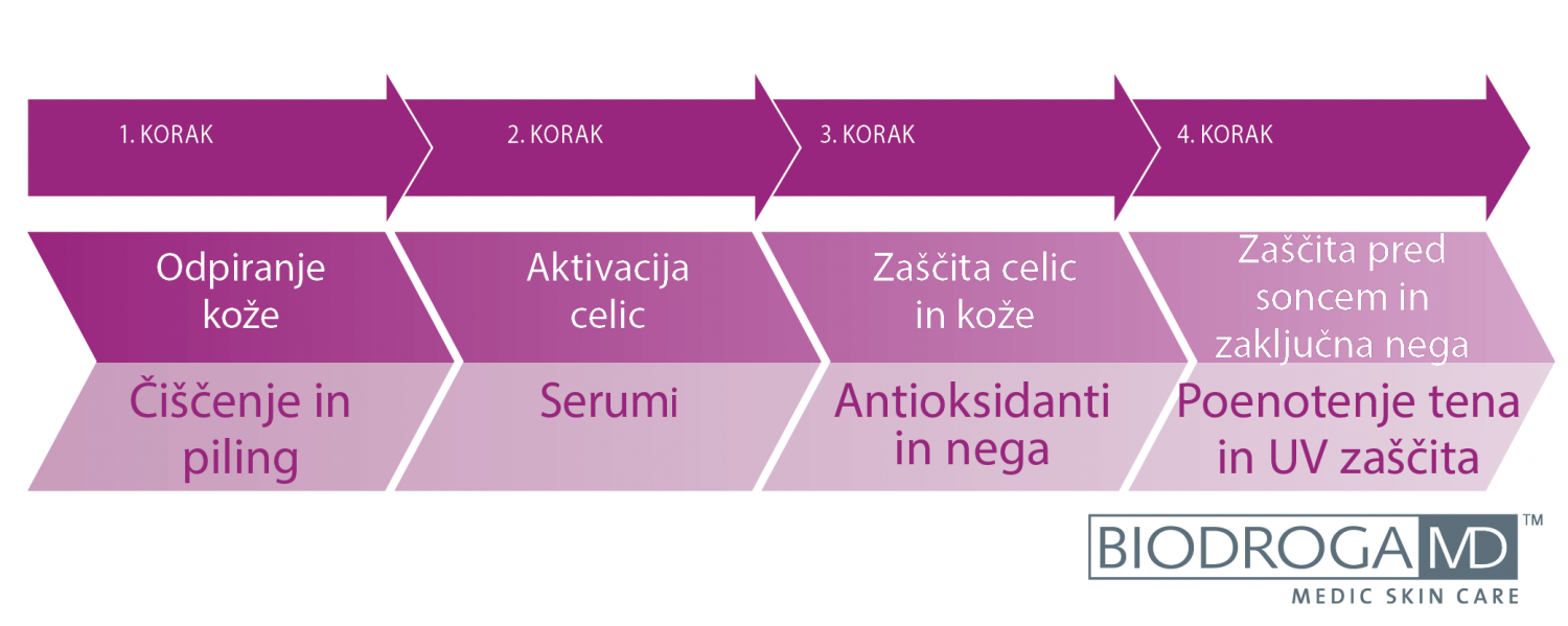 BIODROGA MD kot strokovnjak za učinkovito kozmetiko povezuje nego telesa ne samo z aparaturami temveč jo približa tudi medicini. BIODROGA MD CELLMED METODO deluje sistematično, da povrne koži njeno ravnovesje in zdrav izgled.BIODROGA MD koncept, ki je namenjen specifičnim tipom kože z njihovimi specialnimi potrebami nudi medicinsko„negovalno rešitev“ v štirih korakih. Vsak korak je pomemben kot osnova za naslednji korak.