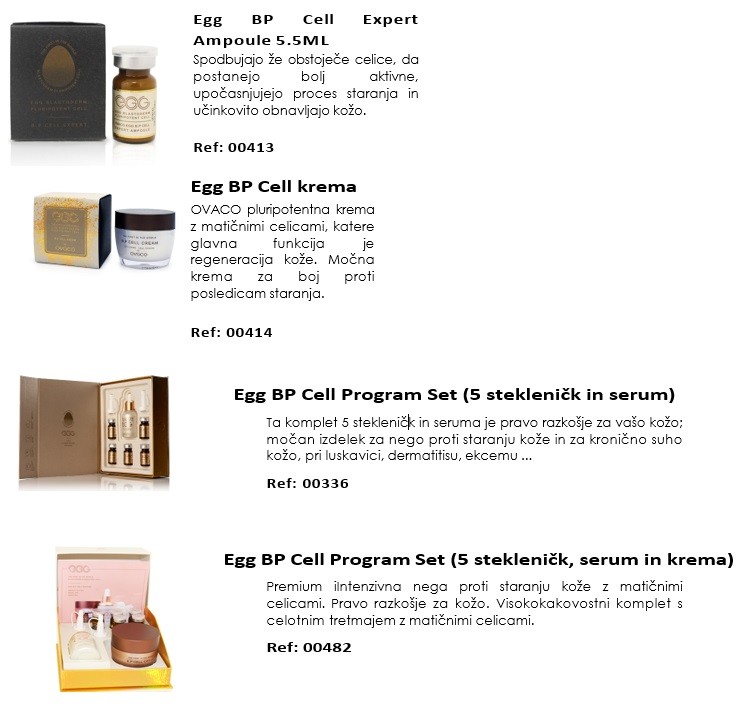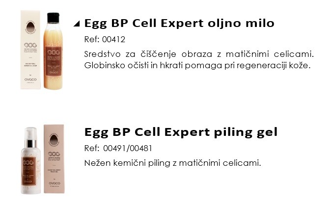 Poleg oljnega mila Egg BP Cell Expert Oil Soap in piling gela Egg BP Cell Expert, ki se uporabljata za čiščenje, so na voljo še 3 patentirani izdelki z zelo visoko koncentracijo pluripotentnih matičnih celic za nego obraza: