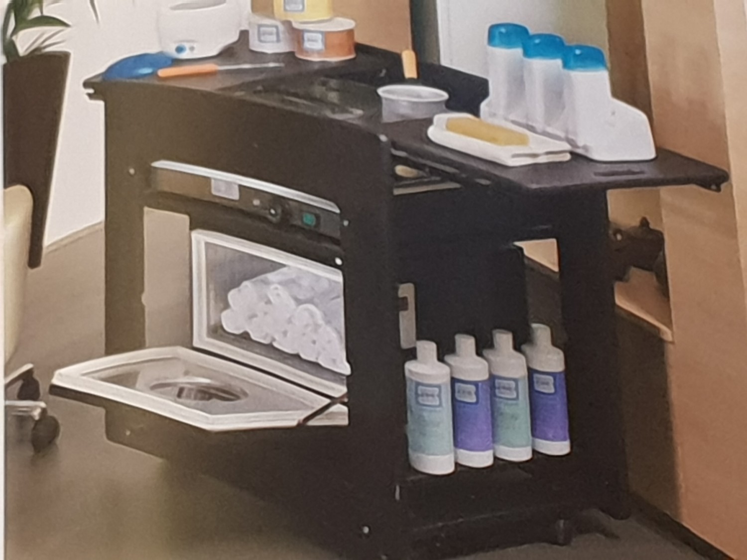 Voziček Guru s grelno ploščo in posodami za produkte k njegi telesa in obraza. Primeren za depilacio in masaze.Več namenski. Nov z masivnega lesa.