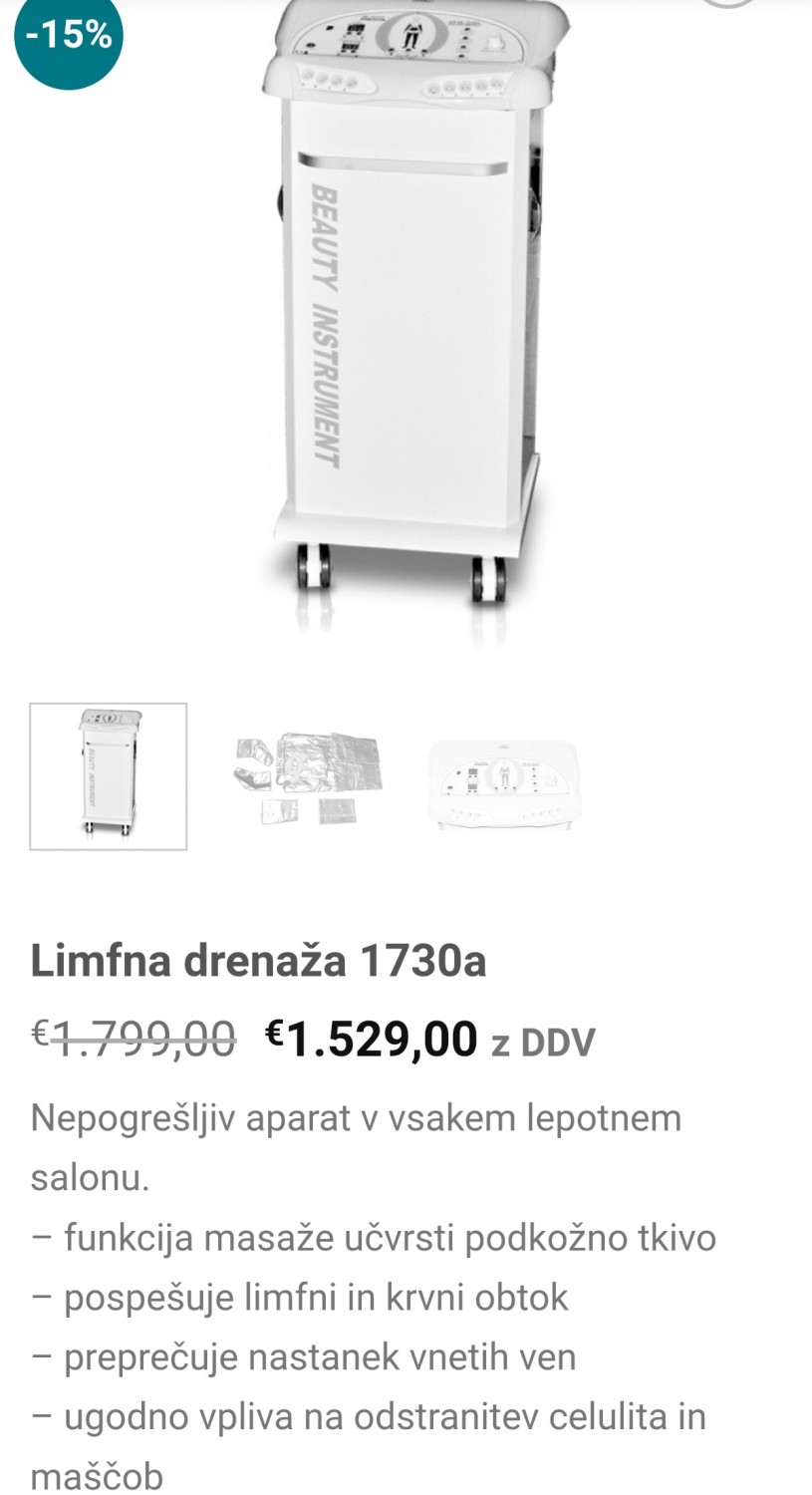 Natalija Zebec Pošlji sporočilo Prodam izdelek 999,00 € 2000 Maribor Poglej na zemljevid Pošlji sporočilo Prodam zelo malo rabljeno limfno drenažo. Deluje brezhibno. Prodaja se zard sprememb storitev v podjetju. Limfna strojna drenaža Natalija Zebec Pošlji sporočilo Prodam izdelek 999,00 € Pošlji sporočilo