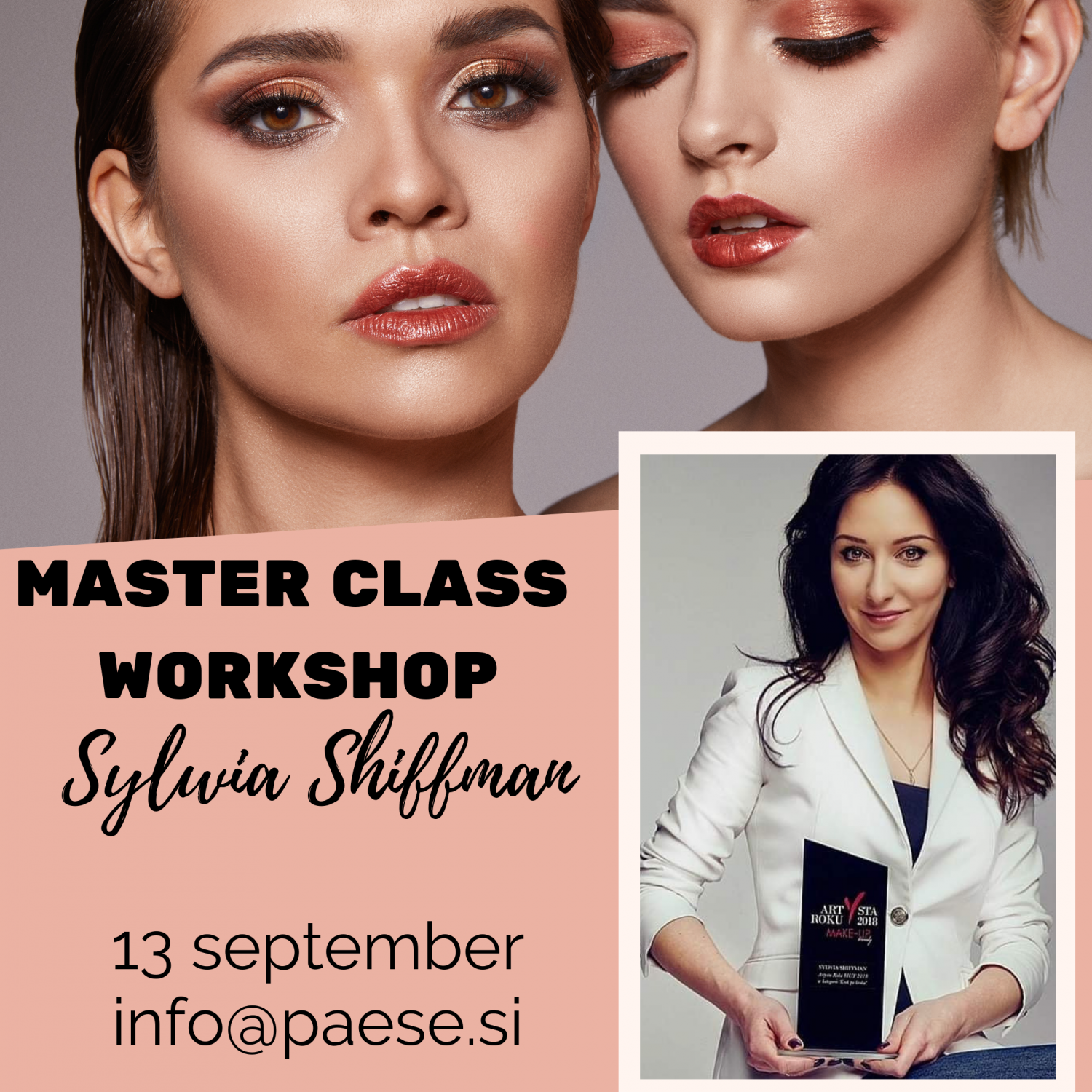 Skupinski tečajVabljeni na master class workshop z vodilno vizažistko in GURU MAKEUP Sylwia Shiffman. Sylwia je glavni vizažist PAESE Brenda iz Poljske .V beauty industriji je prisotna že več kot 19 let.Poučuje vse znane vizažiste in tudi glavne distributerje po celemu svetu. Pri Paese kozmetiki predava že 9 let in tudi kot mentor na univerziteti. Bila je nagrajena kot najboljši makeup artist 2018 na Poljskem "kot finalistka"MAKEUP TRENDE MAGAZINE" v letih 2014,2016,2017 in 2018 je imela tudi 2x2 mesto v kategoriji"step by step". Je tudi sodnica na mednarodnih prvenstvih v makeup kategoriji. Sodeluje z velikimi zvezdami show biznisa , ureja politične osebnosti in glasbenike.Ličila Poljsko tekmovalko na Evrovision song 2017 v Ukrajini. Direktor in lastnica "Image institut Sylwia Shiffman". Letos se je že predstavila na sejmu kozmetike v Ljubljani, kjer so bili navdušeni nad njenim delom številnu vizažisti,frizerji in kozmetičarke iz cele Slovenije. Sedaj imaš takšno priložnost tudi ti!
