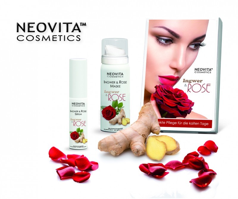 Neovita Ingver & Rose Set, poseben program razvajanja za profesionalno kot tudi domačo nego kože. Serum in Maska sta posebno usklajena in se dopolnjujeta ter ščitita kožo pred hladnimi vremenskimi vplivi. Dobro uravnotežena kombinacija moči ingverja ter dragocenega ekstrakta vrtnic, aktivira kožno odpornost in nežno stimulira mehanizme za popravilo kože. Zagotavlja celicam celično energijo ter na koži pusti absoluten občutek dobrega počutja. Dragoceni skvalen, karitejevo maslo in jojoba olje nudijo koži pomirjujoč učinek, uravnotežijo izgubo vlage ter skrbijo za zaščito pred izpostavljenostjo kože zimskim vplivom.