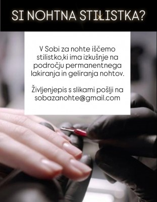 Soba za nohte Pošlji sporočilo Zaposlimo Vir pri Domzalah Poglej na zemljevid Pošlji sporočilo Si nohtna stilistka?Če imaš izkušnje na področju permanentnega lakiranja in geliranja nohtov pošlji slike svojega dela s življenjepisom na sobazanohte@gmail.com Nohtna stilistka Soba za nohte Pošlji sporočilo Zaposlimo Pošlji sporočilo
