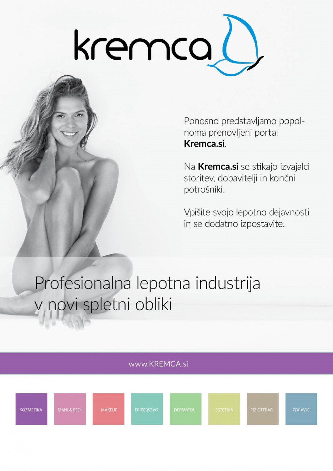 Zelo dobro se zavedamo, da v današnjem času, profesionalna lepotna vsebuje veliko več aktivnih sestavin, podpore in šolanj. Zato vabimo vse proizvajalce, dobavitelje, izvajalce storitev (estetske kirurge, dermatologe, fizioterapevte, maserje, vizažiste, kozmetike, frizerje, pedikerje, manikerje ...), vse vas, ki s svojo dejavnostjo podpirate poslovanje vsem naštetim, in vse vas, ki ste na kateri koli način povezani s profesionalno lepotno industrijo, da na portalu Kremca.si vpišete svojo dejavnost ter se nam pridružite na novem lepotnem potovanju, na katerem lahko predstavite vse svoje dogodke, novosti, reportaže, nasvete, novičke, izobraževanja ali, enostavno oddate brezplačni mali oglas.