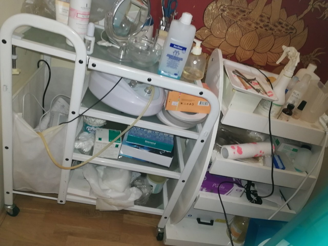 Prodamo lepo ohranjeno opremo za kozmeticni salon,lahko po kosih ali v kompletu. Elektricna kombinirana kozmeticna(masazna) miza,miza za pedikuro,diamantni piling,vapozon,visoka frekvenca,lupa,2 seta za pedikuro,rocni strojcek za pedikuro,grelez za tekoci vosek,grelec za vosek (za 2 kaseti),sterilizator in se vec...