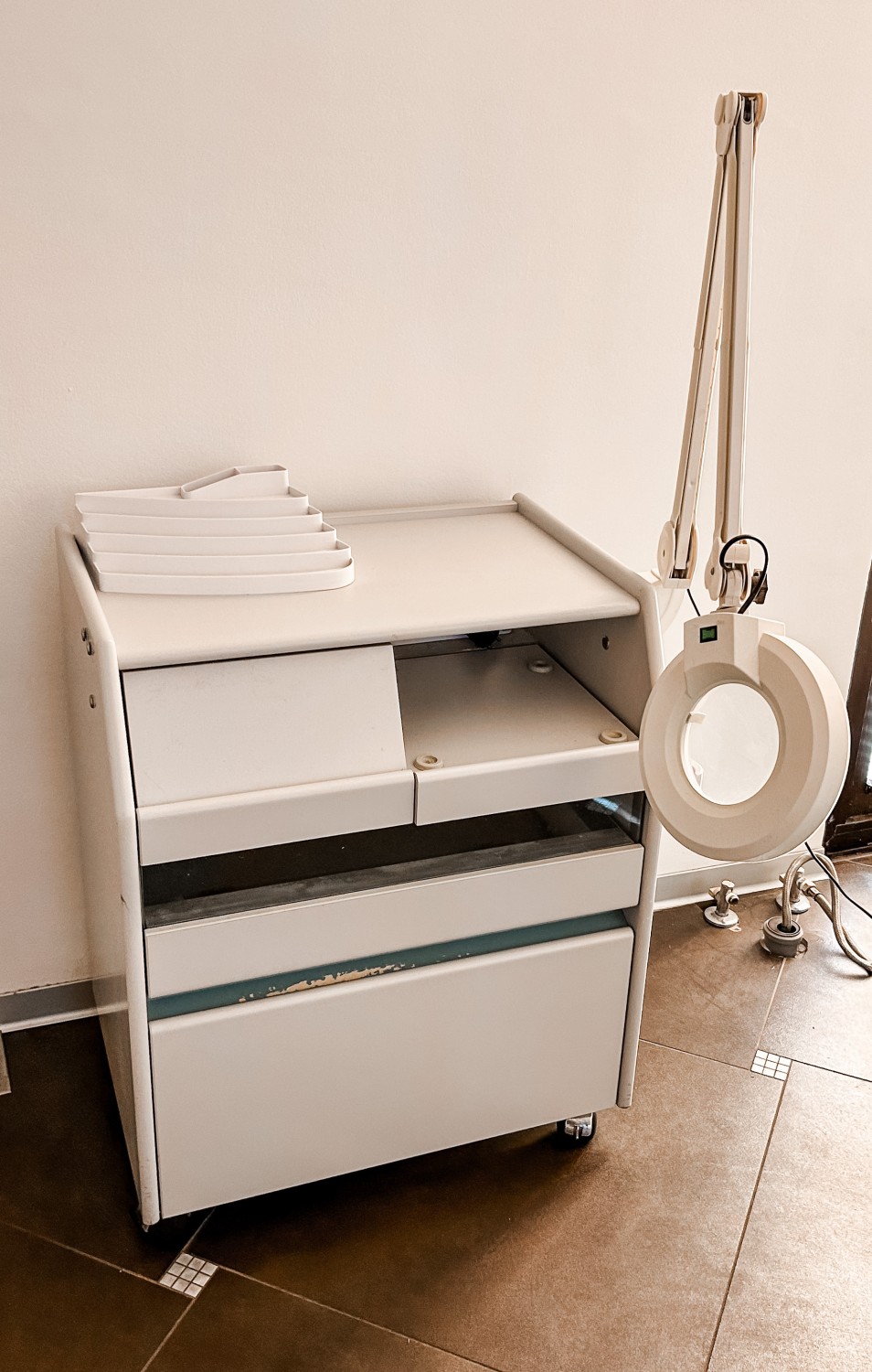 Omarica za kozmetične storitve s kozmetično lupoOmarica (predalnik) za izvajanje kozmetičnih storitev (pedikura, …) s pritrjeno povečevalno kozmetično lupo.Cena: 190 eur