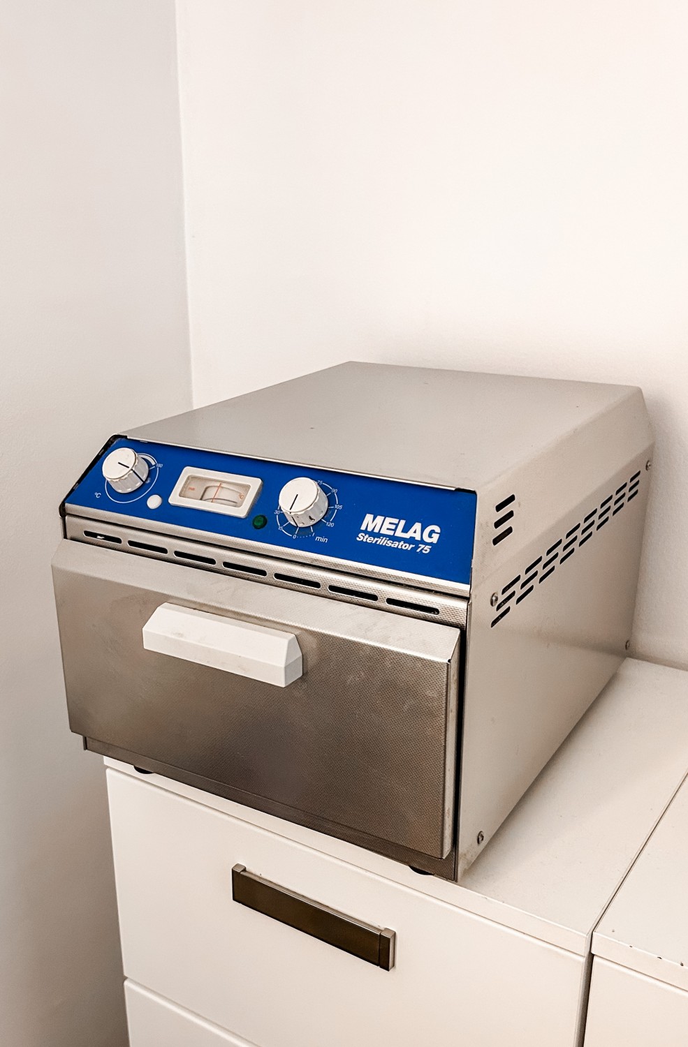 Sterilizator na vroč zrak MelagKompakten in cenovno zelo ugoden sterilizator z vročim zrakom.Deluje na princip kroženja vročega zraka. Notranji in zunanji del sta iz vrhunskega nerjavečega jekla. Cena za nov aparat znaša 800 eur.Cena: 250 eur