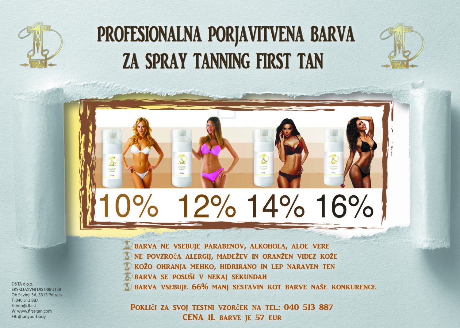 FIRST TAN barva za vse kozmetične salone, ki nudijo storitev teniranja telesa s pršilno pištolo.