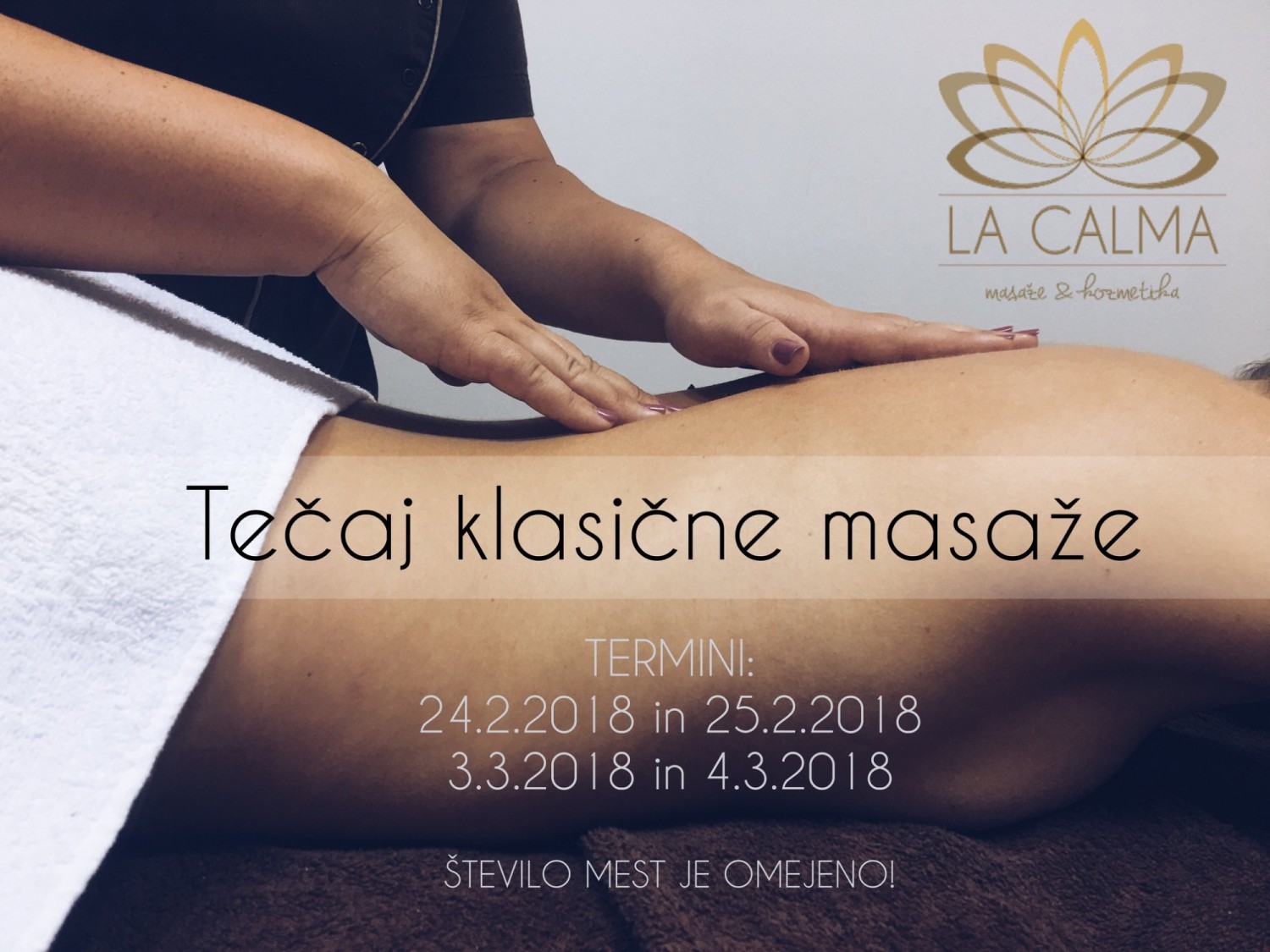 Skupinski tečajDvodnevni vikend tečaj v salonu LA CALMA za vse tiste, ki se želite naučiti klasične masaže. Tečaj je primeren za začetnike in vse tiste, ki vam je klasična masaža že znana.