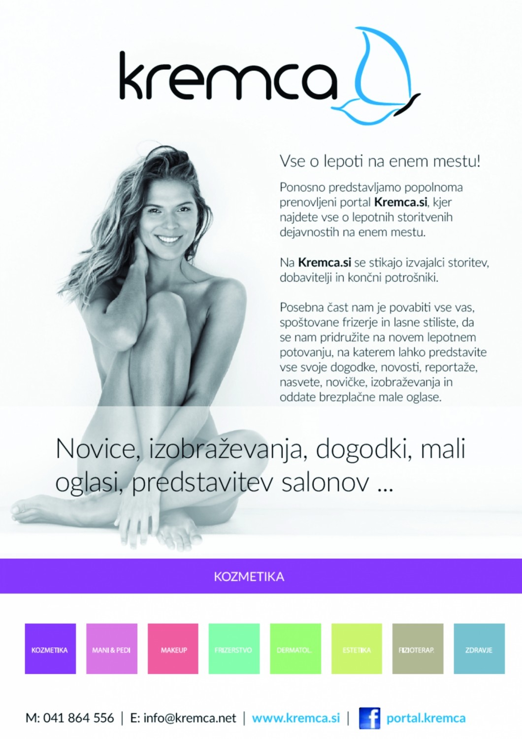 Na portalu je hitro in z lahkim dostopom približana vsa industrija kozmetičnih izdelkov in storitev, nasveti za podjetnike in podjetnice ter mali oglasi, uporabniki pa lahko preko našega portala oglašujejo svoje delavnice, izdelke in storitve ter izmenjujejo mnenja v obliki člankov. Razen omenjenega, na portalu Kremca.net z veseljem predstavljamo vsa izobraževanja, dogodke, novosti, reportaže, novičke, ki so kakor koli povezane s profesionalno lepotno industrijo. Portal vam je na voljo 24 ur na dan, 365 dni na leto, tako da, dragi naši kozmetiki, maserji, pedikerji, manikerji, vizažisti, distributerji, proizvajalci in vsi vi, ki ste kakor koli povezani z lepotno industrijo – z veseljem vas vabimo, da nas sprejemate še naprej!